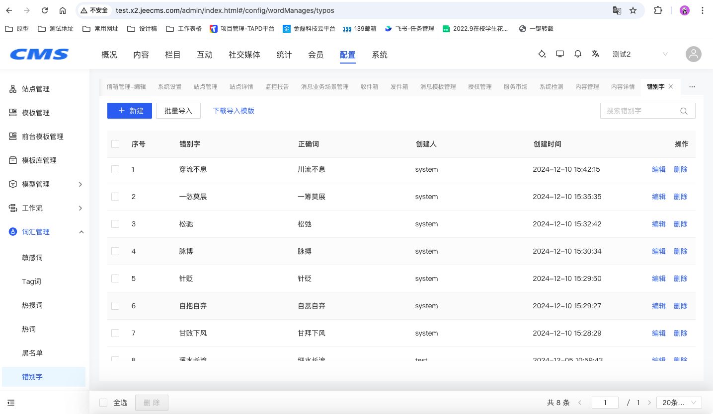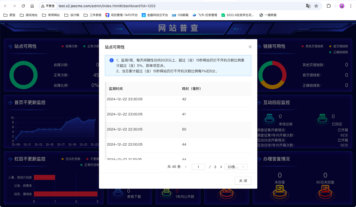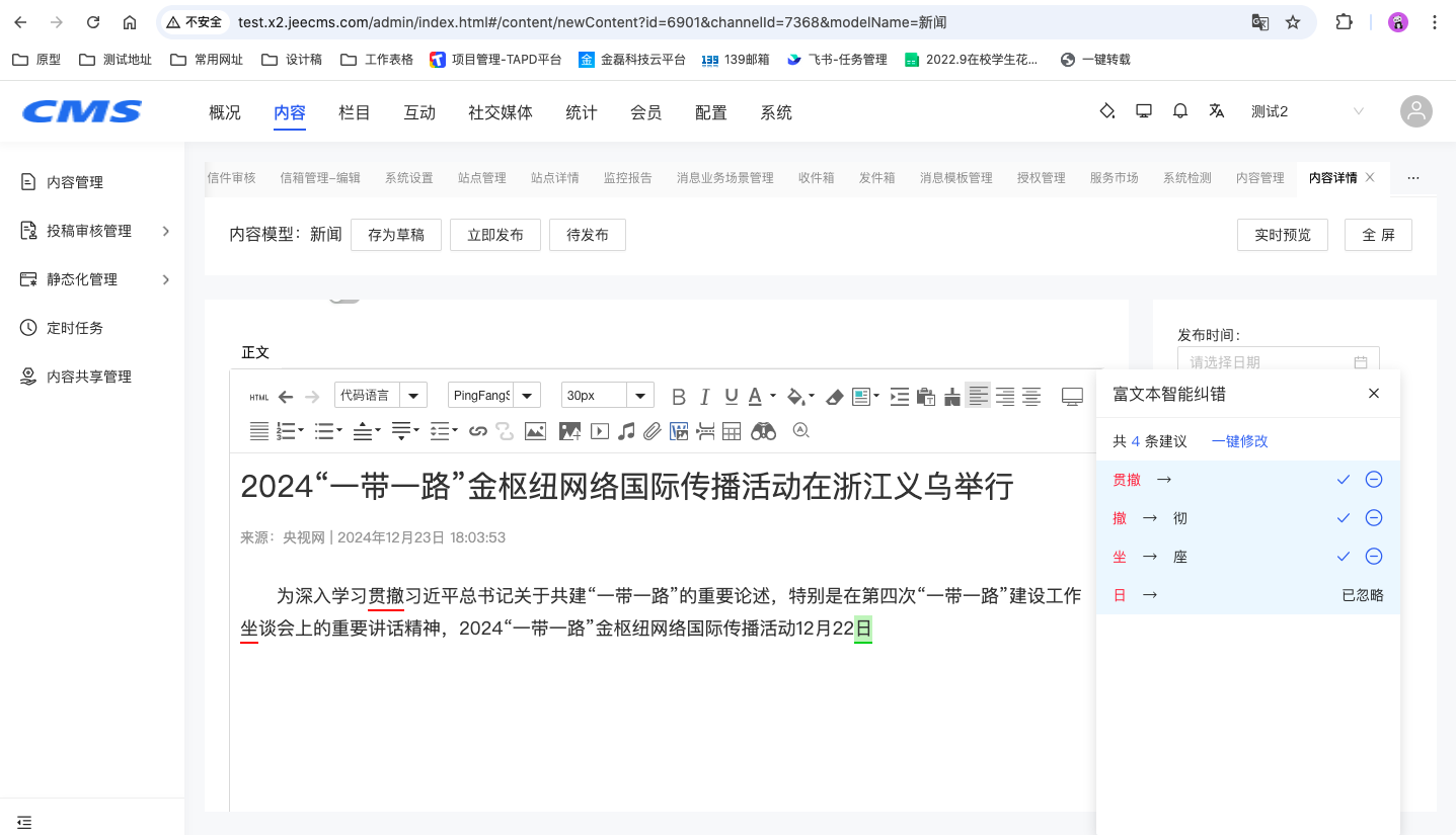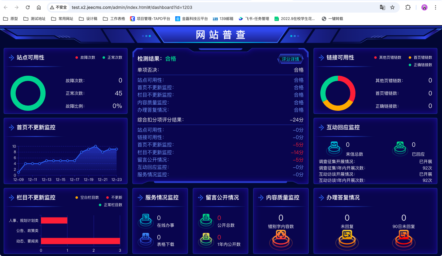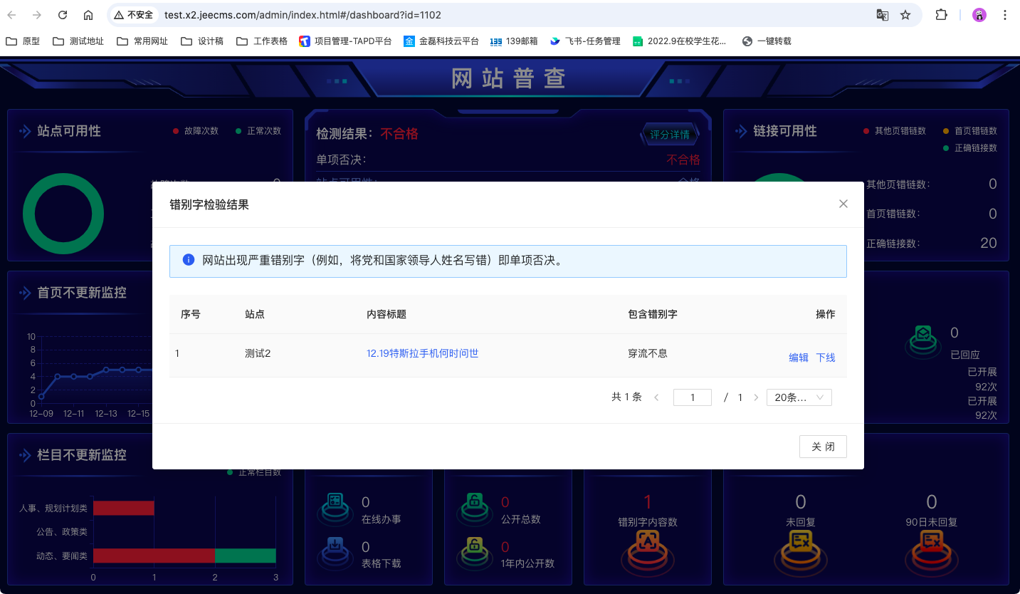 信息安全非常重要!信息安全非常重要!信息安全非常重要!重要的事情說三遍。一站式檢測文本中是否夾雜色情、推廣、辱罵、違禁、涉政、灌水等垃圾內(nèi)容,凈化網(wǎng)絡(luò)環(huán)境,為您的內(nèi)容發(fā)布提供更可靠的內(nèi)容安全保障。內(nèi)容是否有錯別字,站點(diǎn)是否正常,欄目是否更新,鏈接是否可用,留言是否已回復(fù),信件是否已辦理。大屏實時掌握系統(tǒng)使用情況。JEECMS最新版本x2.10帶來的全新體驗--網(wǎng)站普查、系統(tǒng)監(jiān)測、智能糾錯、錯別字管理重磅來襲。讓我們一起看看新版本的功能介紹吧。